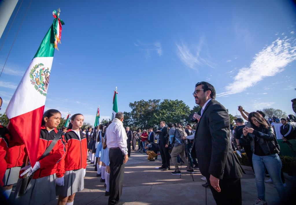Enmarcado por las piezas marciales interpretadas por la banda de guerra de la Novena Zona Militar y la banda monumental del Colegio de Bachilleres de Sinaloa, el evento se desarrolló con civilidad, orgullo y patriotismo, en la Monumental Asta Bandera ubicada en el Desarrollo Urbano Tres Ríos.