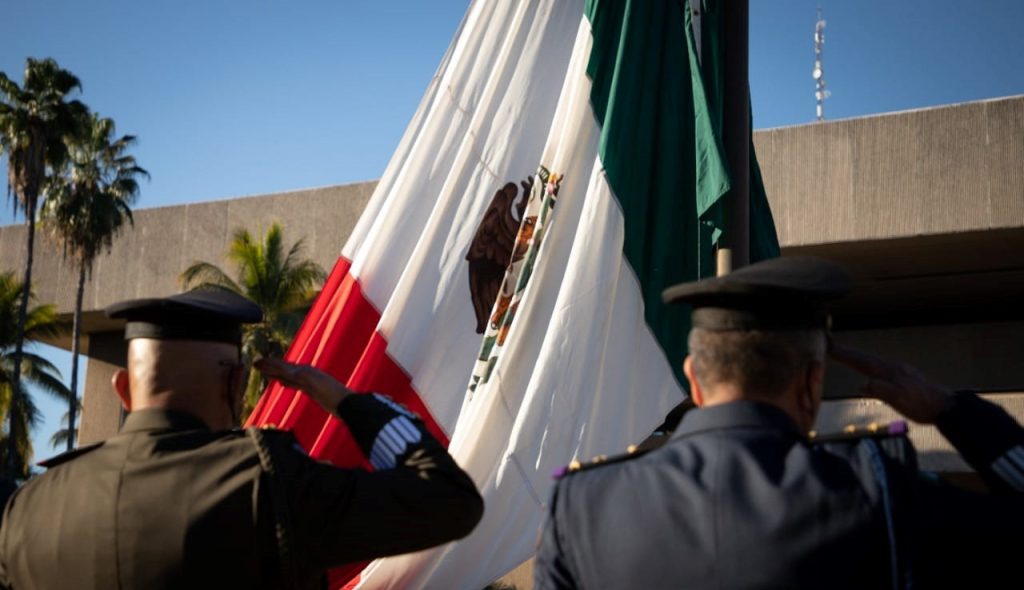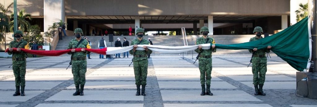 Culiacán, Sinaloa; a 14 de febrero de 2022.- Por el 191 aniversario luctuoso de Vicente Guerrero y a su vez, el 143 aniversario luctuoso de Agustina Ramírez, autoridades civiles y militares llevaron a cabo la ceremonia de izamiento de bandera a media asta con Honores de Ordenanza en la plaza cívica de Palacio de Gobierno.