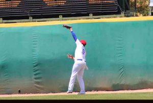 TODO su peso le recargó Jonathan Barrón a un lanzamiento franco y a punto estuvo de enviarla por encima de la barda.