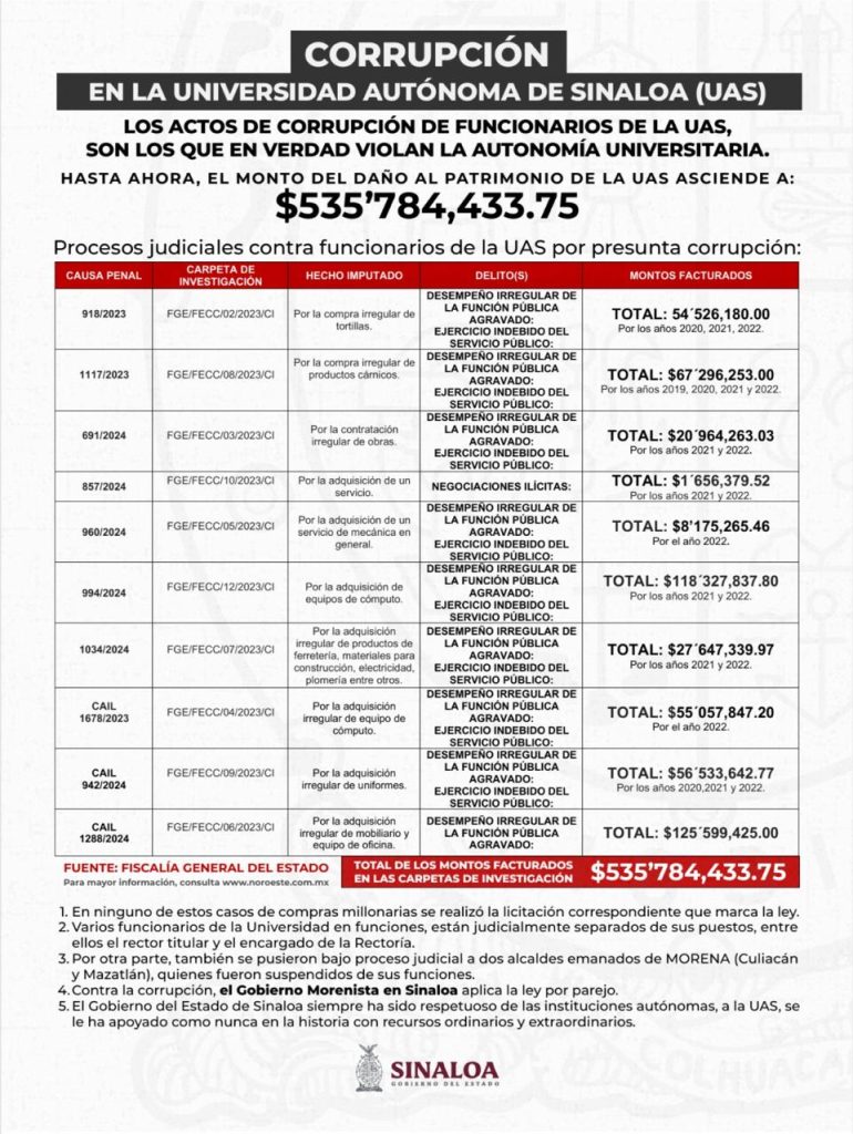 En el referido documento, el Gobierno del Estado de Sinaloa retoma los datos que se han hecho públicos también en investigaciones periodísticas, en donde se detalla que oficialmente a la fecha se han instaurado 10 procesos judiciales contra altos funcionarios de la UAS por presunta corrupción por un monto total de 535 millones 784 mil pesos.