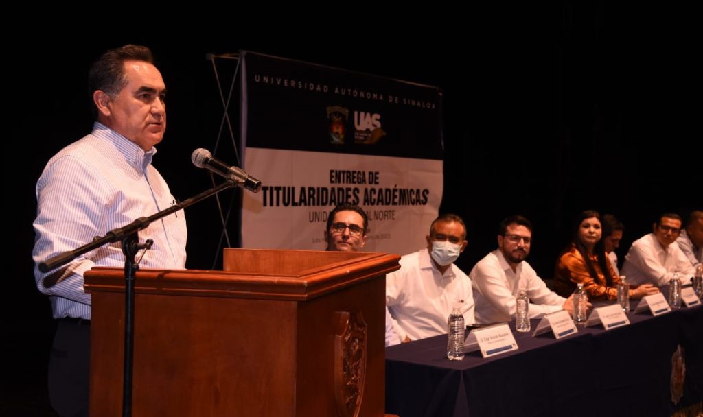 La Universidad Autónoma de Sinaloa (UAS), en concordancia con el nuevo Modelo Educativo que se está implementando en la institución, prioriza los derechos laborales de docentes y trabajadores administrativos, así lo reiteró el Rector, doctor Jesús Madueña Molina durante la entrega de 262 titularidades a docentes de cinco unidades académicas en la Unidad Regional Norte (URN).