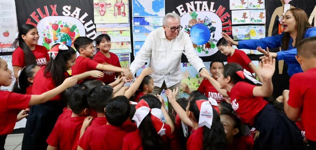 El gobernador Rocha inició su gira de trabajo por el municipio de Ahome, con la visita a la Escuela Primaria Fundación ANDANAC NISSAN, donde primeramente se reunió con las niñas y niños y sus maestros, para escuchar también sus necesidades, y en respuesta a ello, giró instrucciones al director del ISIFE, Hugo Echave Meneses, quien lo acompañó, para dotar de mobiliario al plantel y la instalación también de unos juegos infantiles, lo cual fue lo que le solicitaron los niños en sus aulas.