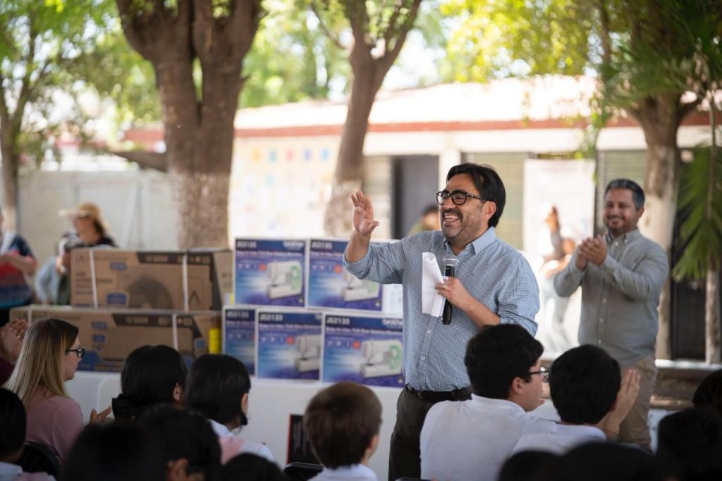 En respuesta a compromisos acordados el 24 de marzo con la comunidad escolar de la secundaria No. 5 “Juan de Dios Bátiz Paredes”, este martes el alcalde Juan de Dios Gámez Mendívil acudió al plantel educativo para hacer entrega de 15 máquinas de coser, dos minisplits y cuatro mesas (tablones), destinados a fortalecer el taller de costura.
