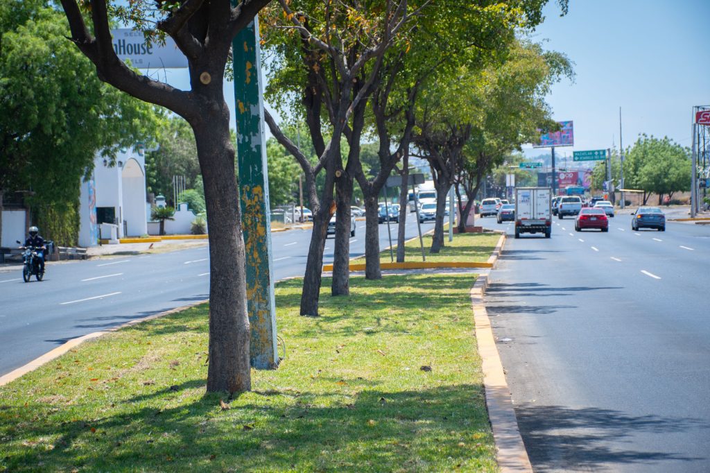 Otro de los ejes de intervención es la instalación de césped en el camellón central, donde se ha optado por pasto tipo San Agustín, una especie resistente a las condiciones climáticas de la región y que requiere menor mantenimiento. Para su adecuado crecimiento, se ha utilizado tierra orgánica tratada con minerales, proporcionada por la Junta Municipal de Agua Potable y Alcantarillado de Culiacán (JAPAC).