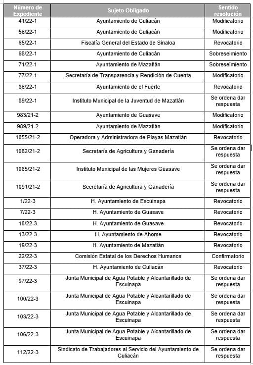 Del total de expedientes, 26 corresponden a recursos de revisión presentados por ciudadanos en contra de 15 dependencias de Sinaloa.