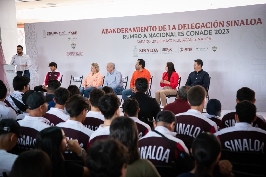 Culiacán, Sin., a 20 de mayo de 2023.- Con una gran cantidad de aplausos y mucha emotividad, se realizó en el palacio de Gobierno del Estado, la ceremonia de Entrega de Banderín a la Delegación Sinaloense que participará en los Juegos Nacionales CONADE 2023, misma que estuvo encabezada por el gobernador del Estado, Rubén Rocha moya, acompañado por el alcalde Juan de Dios Gámez Mendívil, y el director del Instituto Sinaloense del Deporte, Julio César Cascajares.