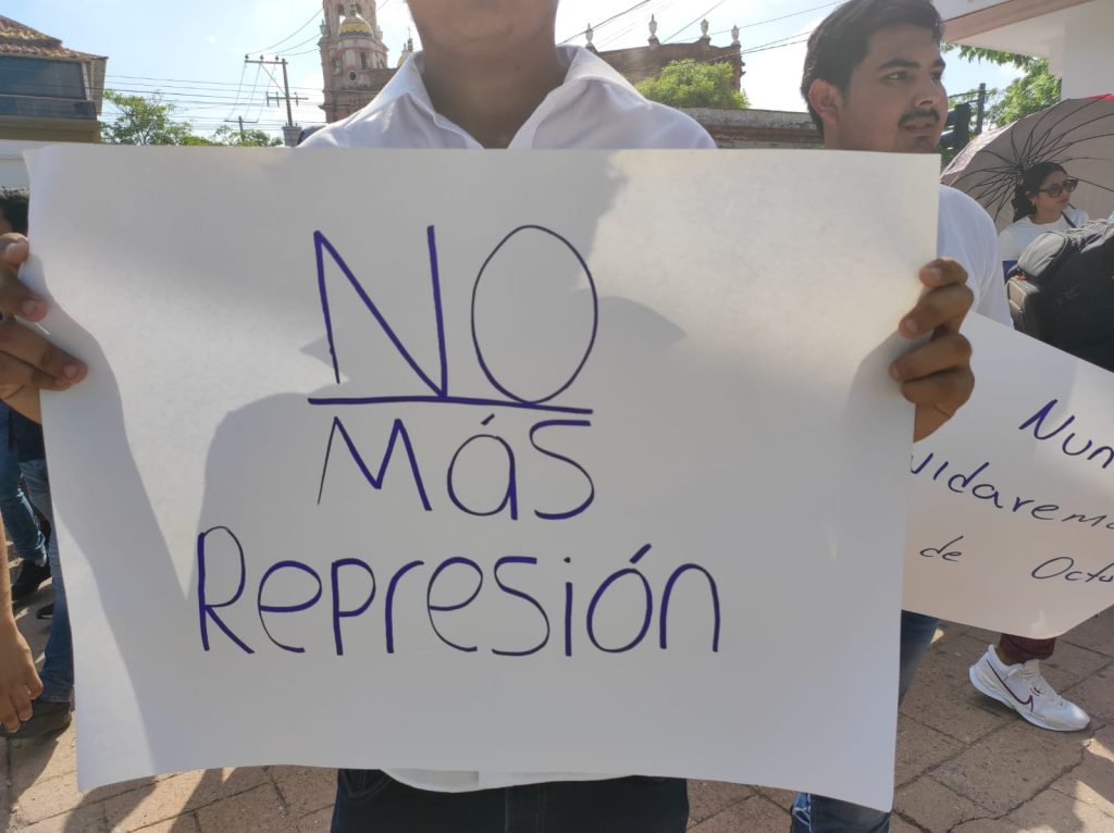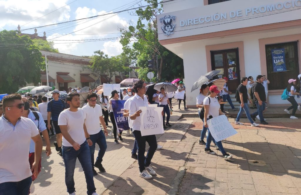 El grupo de estudiantes portaron mantas y cartulinas alusivas a la no represión y a la paz en la entidad, y se desarrolló de manera pacífica por los diferentes calles del primer cuadro de la ciudad.