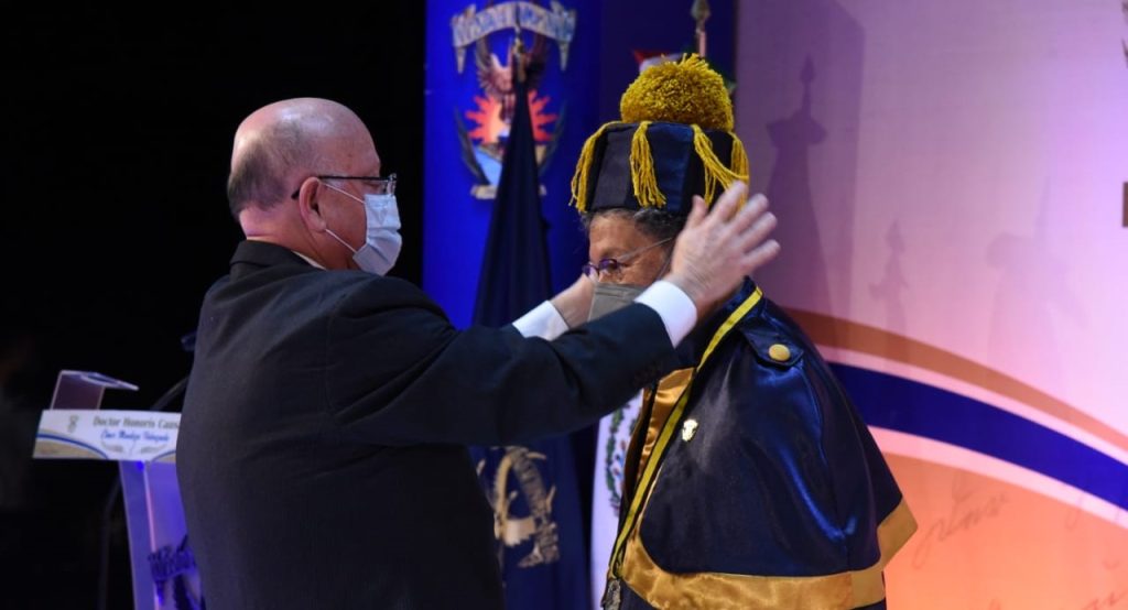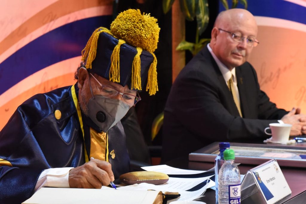 En Sesión Solemne Virtual del H. Consejo Universitario, el Rector y presidente del Consejo, doctor Juan Eulogio Guerra Liera, colocó la capa, la medalla, el escudo de la Universidad y el birrete para investir a Élmer Mendoza con el máximo grado de reconocimiento que otorga esta institución educativa.