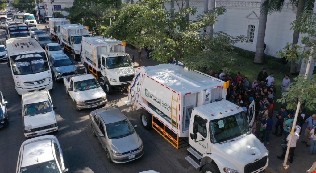 Culiacán Sinaloa a 16 de enero del 2023.-El alcalde de Culiacán Juan de Dios Gámez Mendívil, acompañado de un grupo de regidores, hizo entrega a la dirección de servicios públicos municipales y dio el banderazo de salida de 4 camiones de recolección de basura, con ello se pretende ir renovando poco a poco la flotilla con la que se cuenta el servicio de recolección en el municipio.