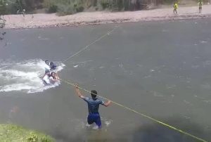 Gracias a la oportuna intervención de dos rescatistas del Grupo de Rescate Acuático de la SSPYTM, un niño y dos adolescentes que eran arrastrados por la fuerte corriente del río a la altura de Ayuné fueron restados del agua evitando con esto que la corriente se los llevara y se pusiera en riesgo su vida.