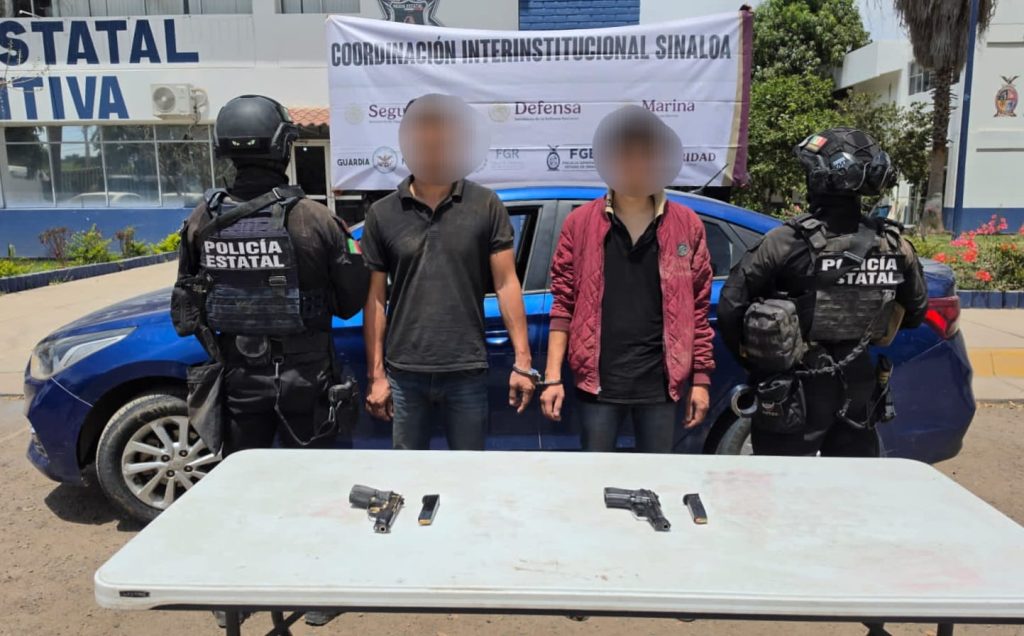 Posteriormente, en el mismo sector, los elementos detectaron un vehículo sedán con vidrios polarizados cuyo conductor intentó huir, siendo alcanzado metros adelante; en esta acción fueron detenidas dos personas a quienes se les aseguró un arma corta calibre .380, otra calibre 9 milímetros, cargadores y cartuchos, así como el vehículo en el que se desplazaban.