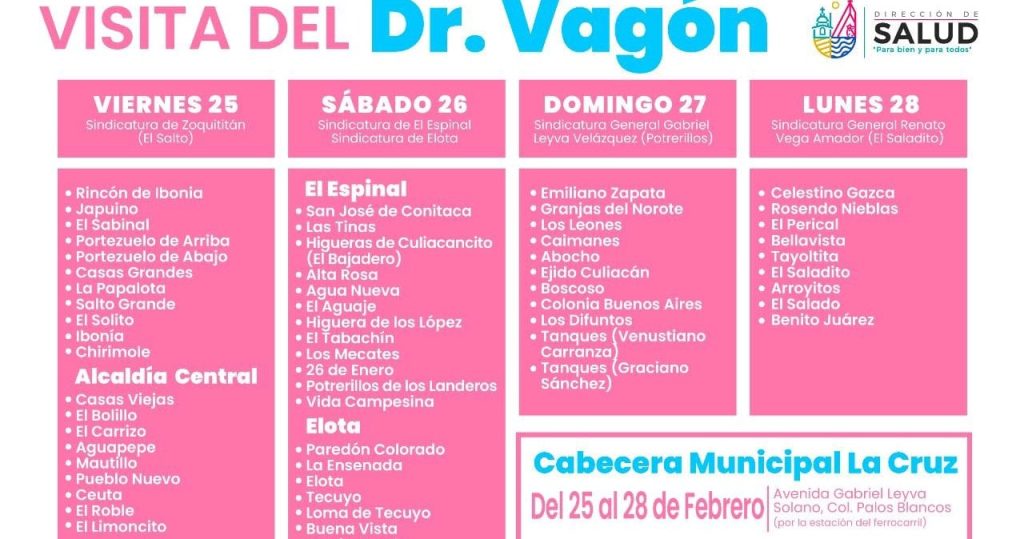 La programación es la siguiente: viernes 25 de febrero, le corresponde a la sindicatura de Zoquititán (El Salto) y comunidades de la Alcaldía Central; sábado 26 de febrero, sindicaturas de El Espinal y Elota; domingo 27 de febrero, la sindicatura General Gabriel Leyva Vázquez (Potrerillos del Norote); lunes 28 de febrero, la sindicatura General Renato Vega Amador (El Saladito) y la Alcaldía Central; y la cabecera municipal La Cruz se atenderá todos los días.
